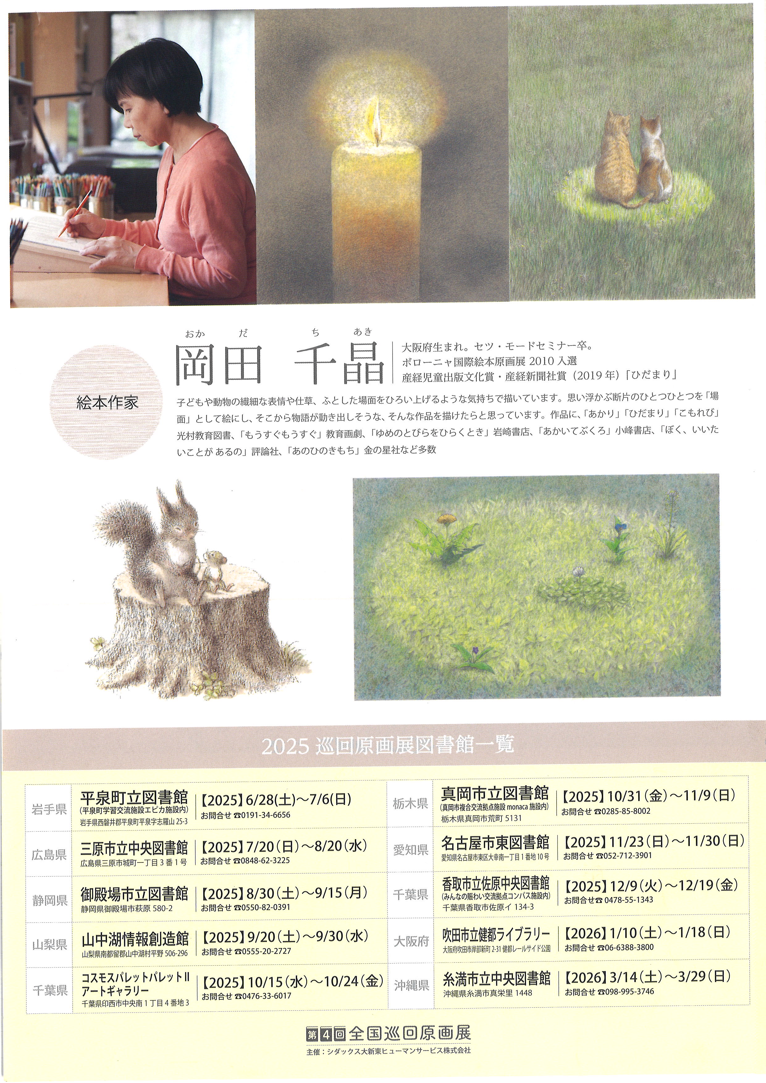 絵本作家、岡田千晶さんの原画展を健都ライブラリーにて開催します。